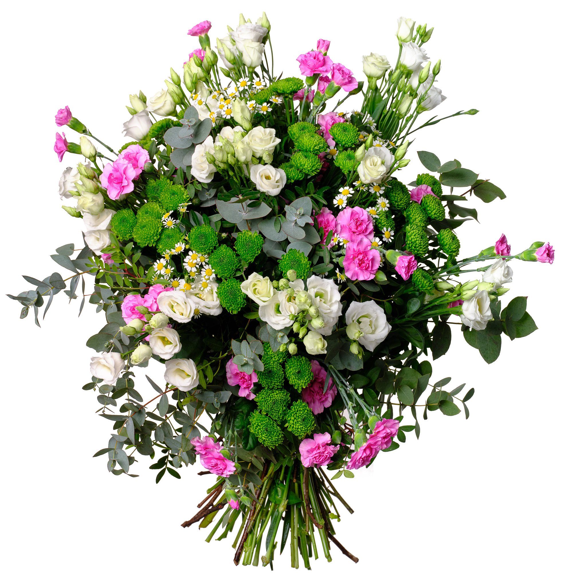 Exkluzivní 7 ks bílá eustoma, 10 ks růžový trsový karafiát, 7 ks santini, 3 ks heřmánek a dekorativní zeleň (pistacie, eukalyptus)