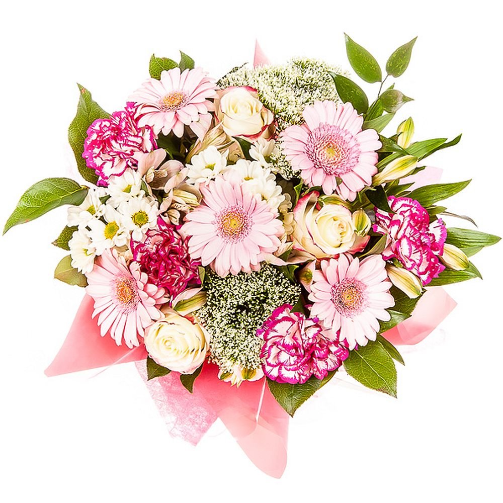 | Standardní | 3 ks karafiát, 3 ks růže, 3 ks gerbera mini, 2 ks santini, 1 ks gypsophila, 2 ks alstromeria, manžeta, mašle a dekorativní zeleň (italský ruscus, salal) |